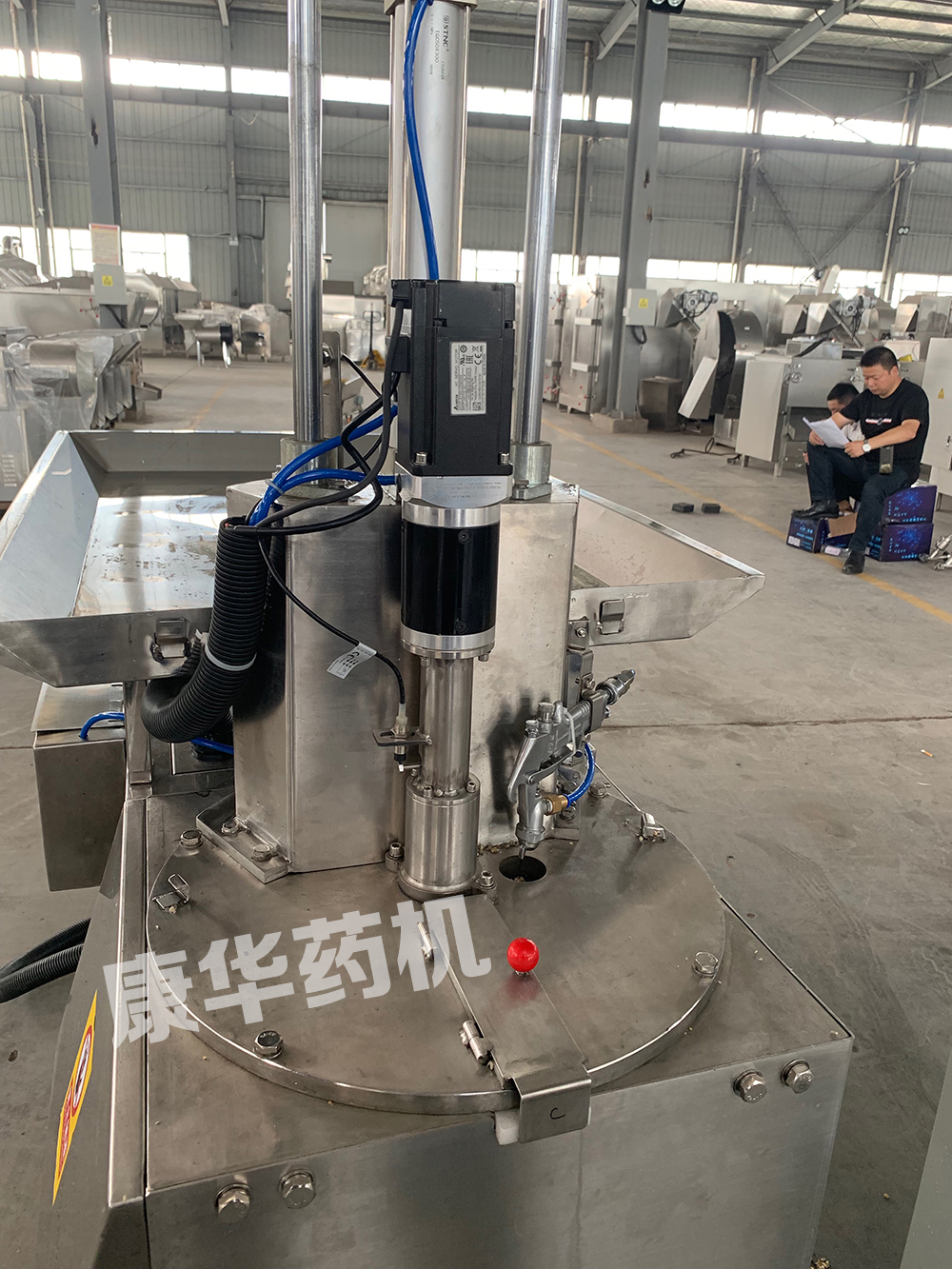 工作原理:將物料放入相應(yīng)進(jìn)料斗,氣缸自動(dòng)壓料,切刀固定于轉(zhuǎn)盤正面,轉(zhuǎn)盤與切刀的合適間隙通過伺服電機(jī)控制刀盤上下調(diào)節(jié),當(dāng)電機(jī)帶動(dòng)刀盤,將物料切成片狀。配有水槍噴霧裝置,使刀片切制藥材不容易粘刀,片形更好。